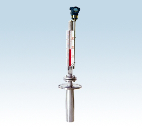 該產(chǎn)品由本體(由上、下導(dǎo)管組成)、翻板箱(由紅、白雙色磁性小翻板組成)、浮子(由磁體、頂桿、浮筒 組成)、以及液位變送器等組成,其結(jié)構(gòu)如圖所示。工作原理為:容器內(nèi)的浮筒(按不同介質(zhì)和壓力針對研制), 在下導(dǎo)管中隨液面高度的變化而上下浮動并通過頂桿使磁體在上導(dǎo)管內(nèi)上下移動,促使本體外的翻板翻動 并顯示紅、白顏色來指示液面高度,同時液位變送器將液位信號傳送至控制中心進行液位指示和控制,也 可通過計算機進行集中監(jiān)控。